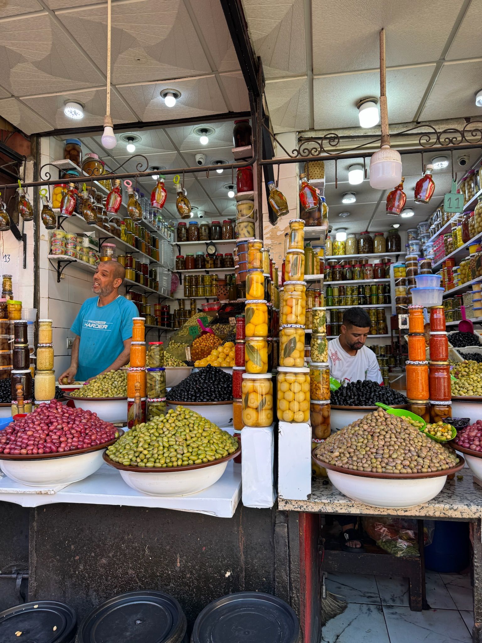 Derefter skal vi omkring Jamaa el Fna. Pladsen, der i århundreder har været ramme om adspredelse og underholdning og i dag rummer et af verdens største popup-køkkener, der koger og steger hver eneste aften 365 dage om året. Vi går også forbi Souk Ablouh, hvor oliven og alskens syltede lækkerier, såsom de kendte marokkanske saltsyltede citroner, står linet op til salg.