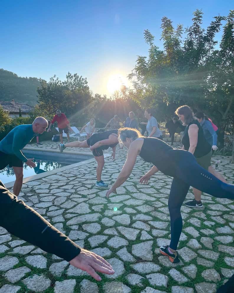8.30 Morgengymnastik ved poolen med udsigt til bjergene. Vi strækker kroppen igennem, laver enkle yogaøvelser. Vi slutter af med et par sange.