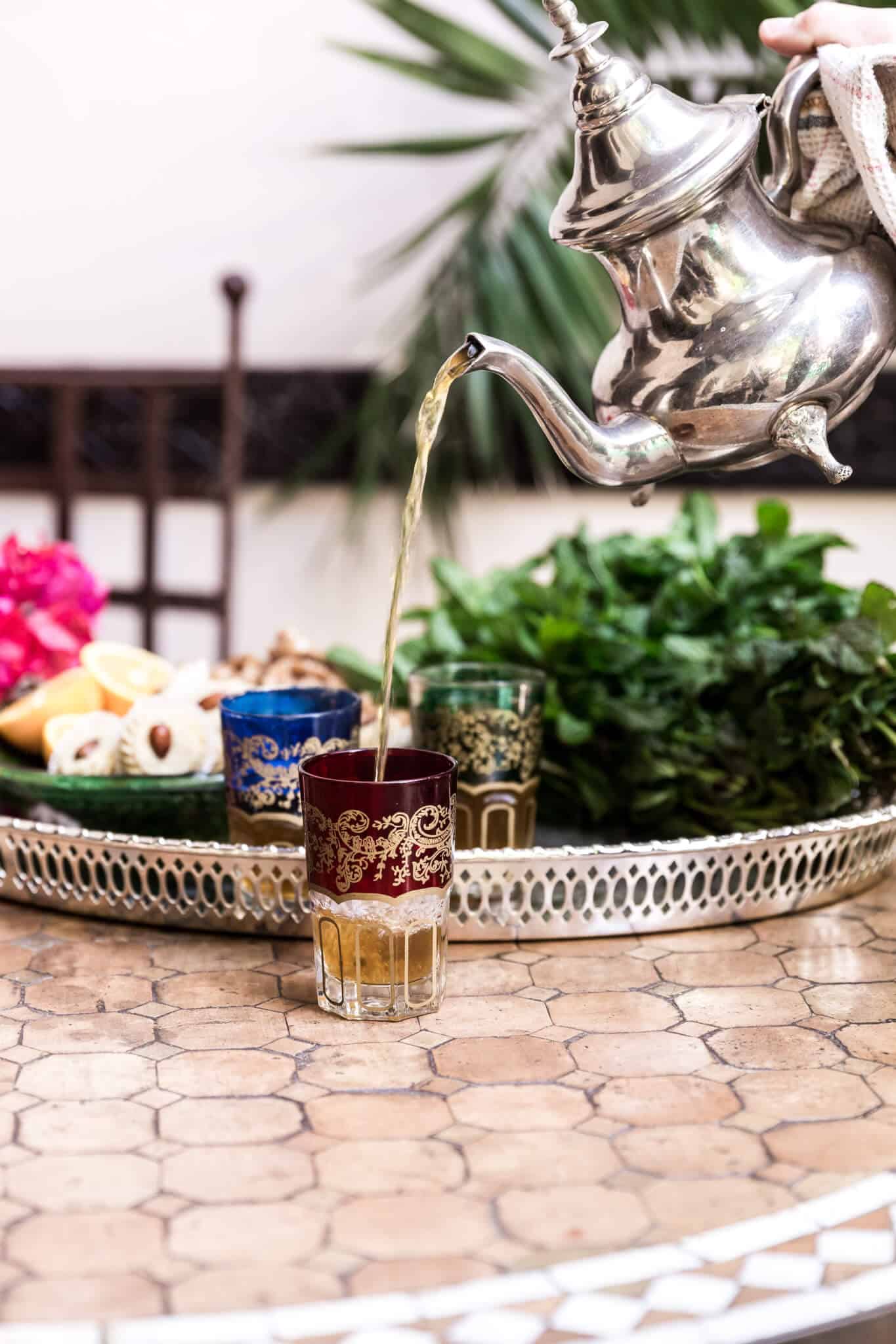 16.30 Tilbage i vores riad har Ditte og Anne stylet et fint kagebord, med lækre marokkanske kager fra den lokale bager, som man kan tage fotos af. Vi får myntete og tager flotte fotos og hygger.