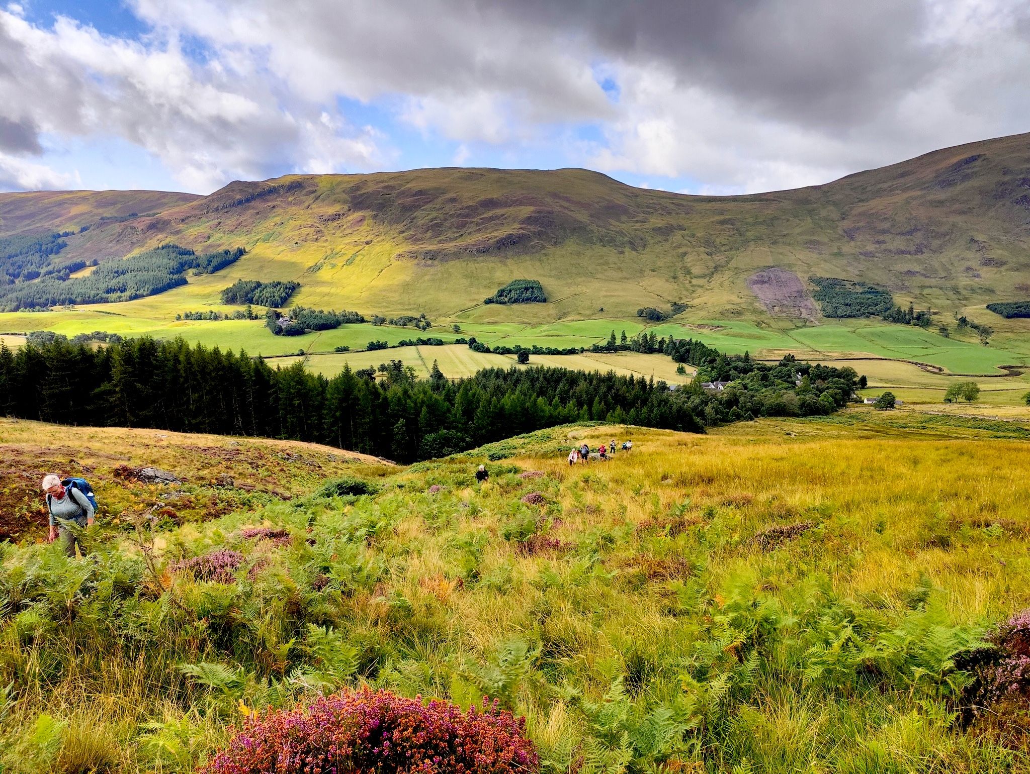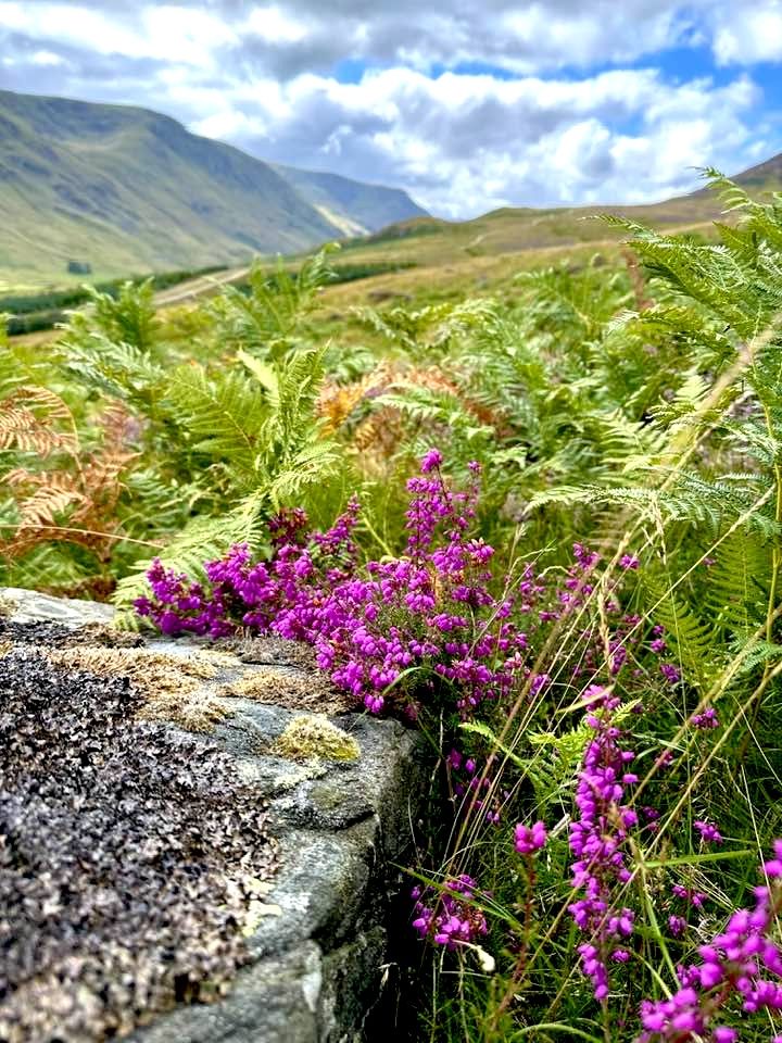 Fra Glen Prosen kører vi i bus ½ time tilbage til højskolen. Både klokkelyngen og hedelyngen er særligt flotte heroppe i bakkerne i august, og der er et helt ”lilla tæppe” på denne strækning.